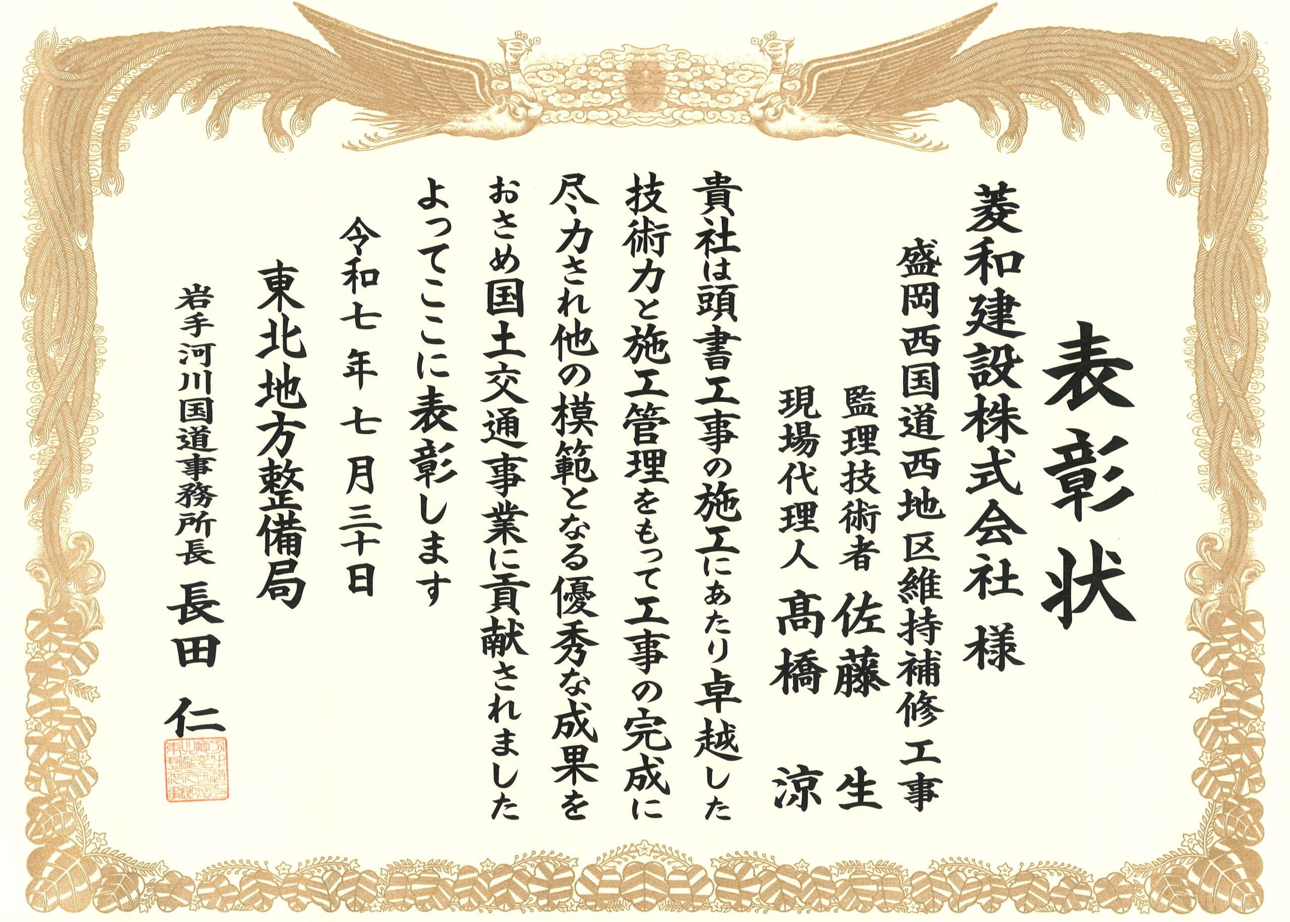 令和5年6月15日(木)、プラザおでってにて建設産業構造改善推進岩手県大会が開催され、土木事業本部工事部・中村昌博さんが優良県営建設工事担当技術者会長顕彰を受賞しました。