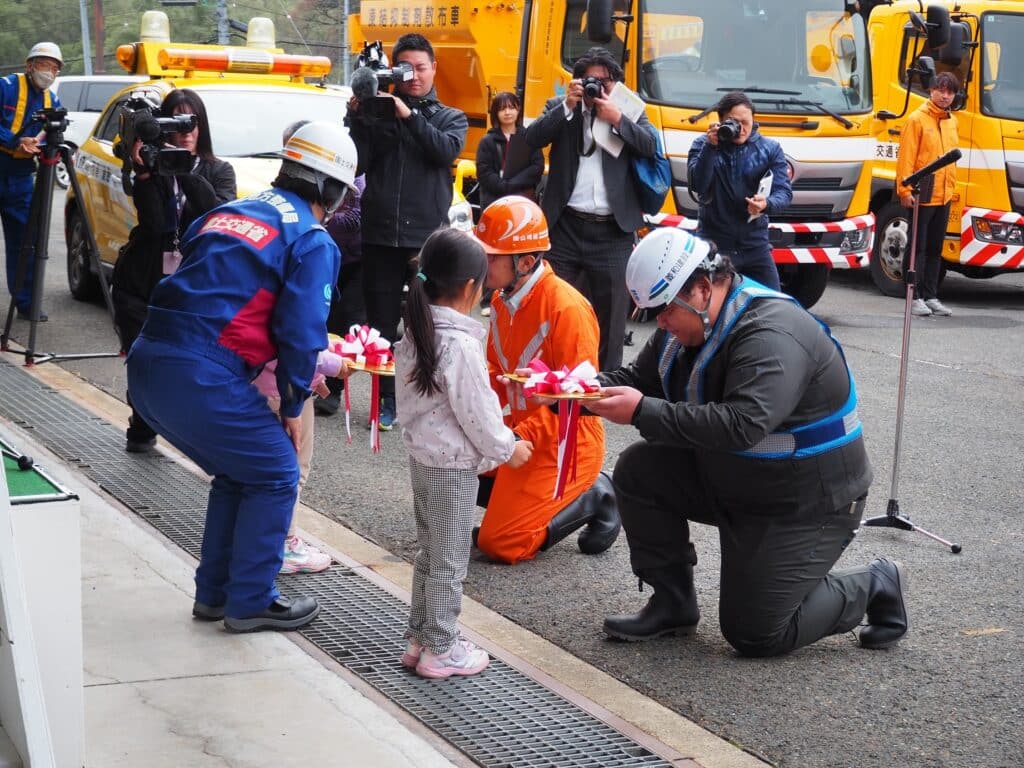 機械が正常に動作することを確認したのち、御明神保育所の園児たちの元気な声に見送られ市街へ向けて出動しました。