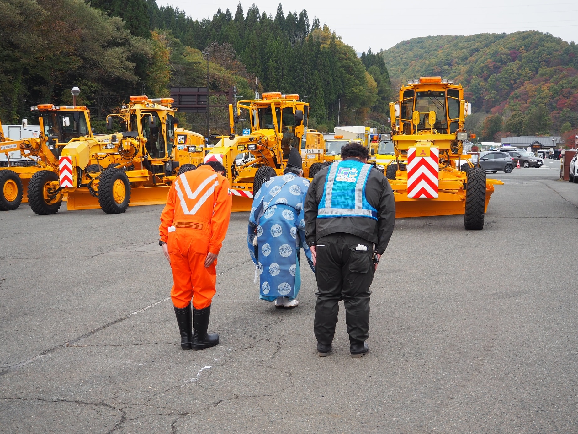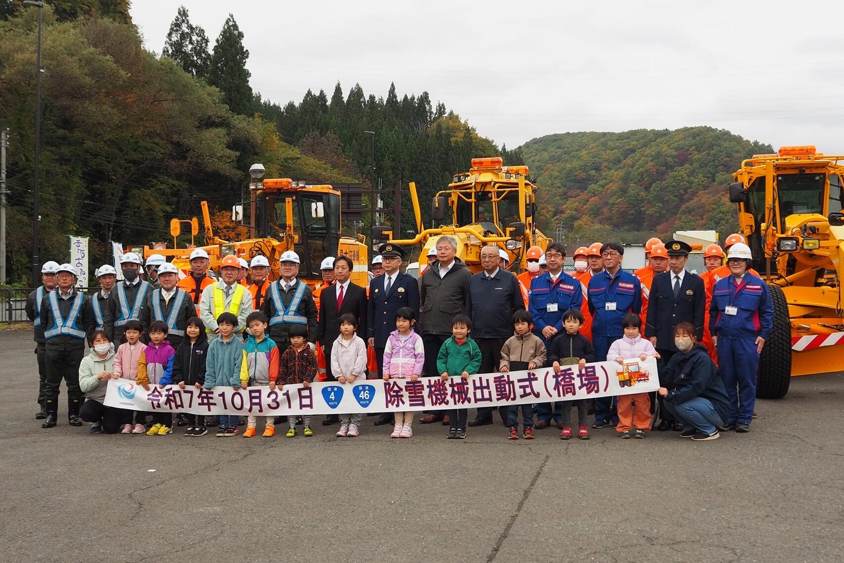 続いて除雪機械出動式へ移り、代理人の号令で作業員が一斉に乗車、除雪機械の安全点検が行われました。